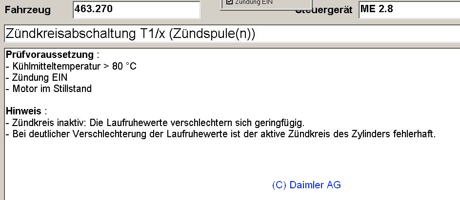Die Regelmäßigkeit der Zündimpulse (Laufruhe: Klopfsensor) kann man mit der Diagnose testen. Die Zündkreise A oder B lassen sich abschalten. Siehe Diagnose: Menue Antrieb, Motorelektronik ME2.8, Ansteuerungen, Zündkreisabschaltung. siehe auch: AH07.00-P-3003WB Ebenso können die Zündwinkel geprüft werden. |