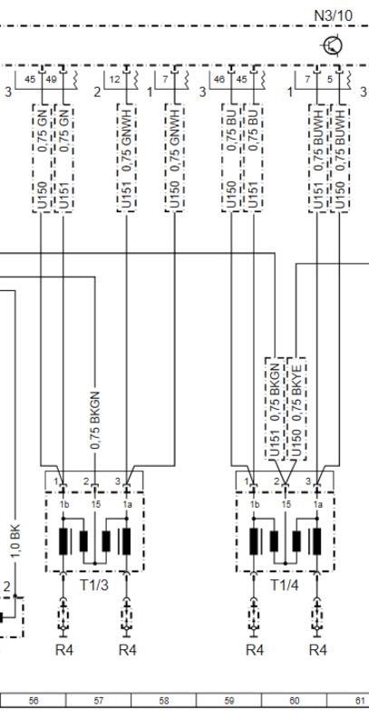 SAM vorn, Klopfsensoren links u.rechts A16/1 A16/2 , Temperaturfühler Kühlmittel B11/4 , Temperaturfühler Ladeluft B17/8 , Druckgeber Ladeluft B238 , Geber Fahrpedal B37 , Positionsgeber Kurbelwelle L5 , Hallgeber Nockenwelle B6/1 . Bidirektional wird mit den Stellgliedern Drosselklappe M16/6 und Umluftklappe M16/7 kommuniziert. Zündsystem Motor-Elektronik ME: Steuergerät N3/10: GF07.61-P-3008AM: |