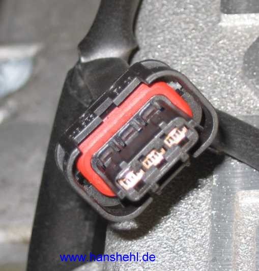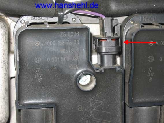 | Die Kabelbinder zur zusätzlichen Sicherung der Stecker nur abzwicken, wenn die Spulen erneuert werden. Neue Kabelbinder sollten beim Einbau wieder angebracht werden. Die vier Stromversorgungsstecker A2035453028 ( System SLK 2.8, dreipolig) zu den Zündspulen abziehen. Dazu muß die Sperre (roter Pfeil) oben beim Kabeleintritt zum Stecker hin gedrückt werden, dann kann man den Stecker abziehen. Die Sperre kann dabei leicht abbrechen. |