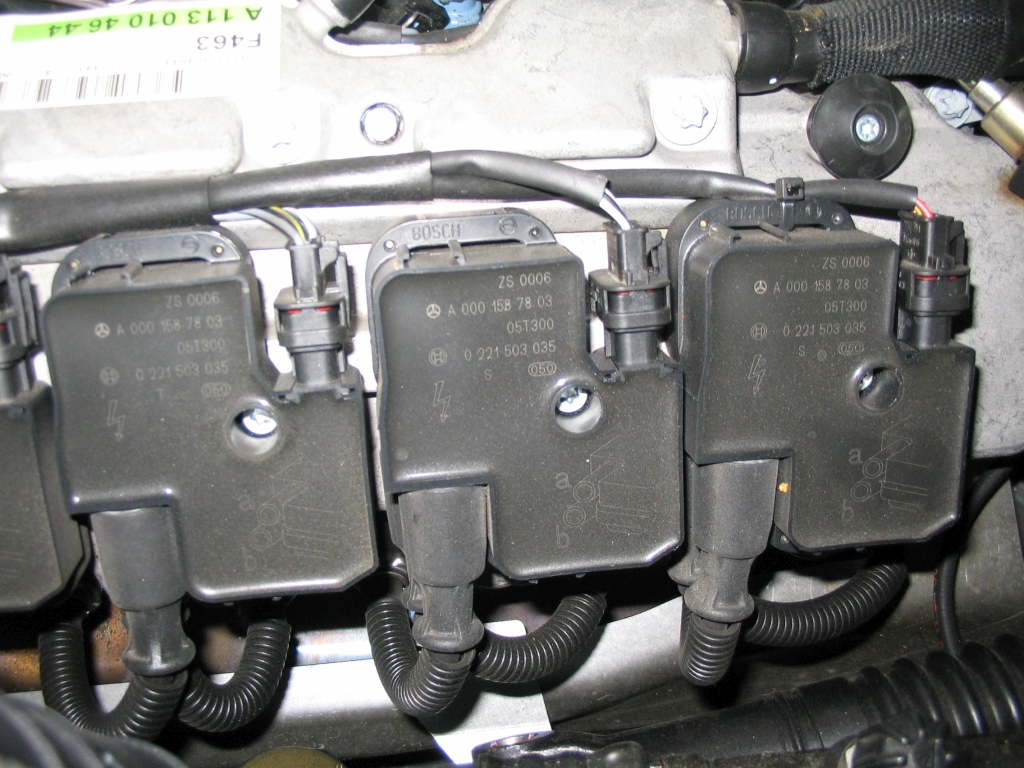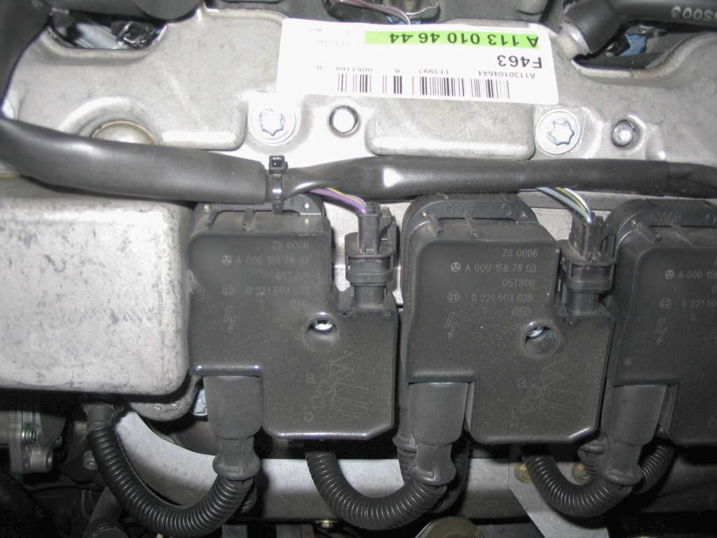 Jede Doppelzündspule A0001587803 - Bosch: 0221503035 ist mit einer Schraube befestigt. Es sind zwei Zündkabelanschlüsse a / b und ein dreipoliger Steckanschluss vorhanden: Pin 1 und 3: führen zu den Anschlüssen Steuergerät N3/10 ME 2.8.1 Pin2: Kl.15, +12V, Z3/29 2, Sicherung f19 beim SL55AMG 230.474, f48 beim G55AMG 463.270 . Das ME schaltet die Primärwicklungen (wenige Windungen) der Doppelzündspule gleichzeitig an Pin 1 (Kl.1b) und Pin 3 (Kl. 1a) an Masse. linke Zylinderreihe: Zylinder/Zündspule von links 5,6,7,8 |