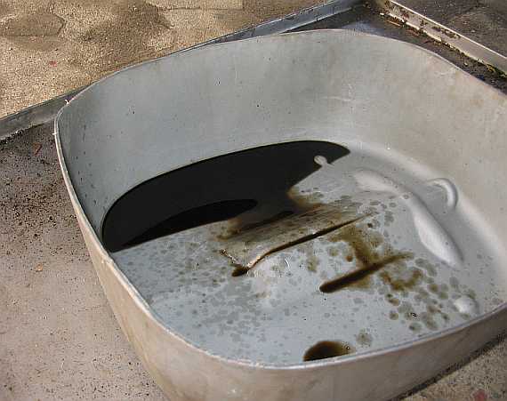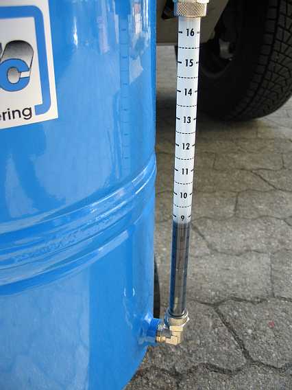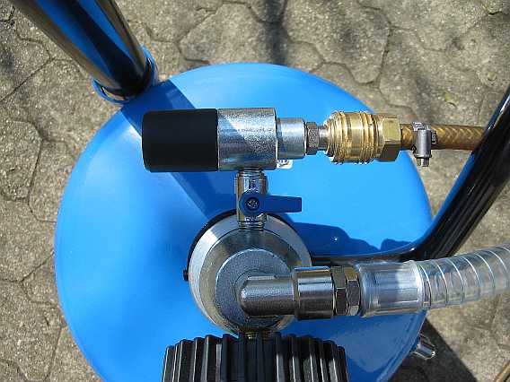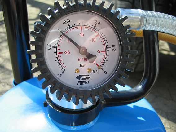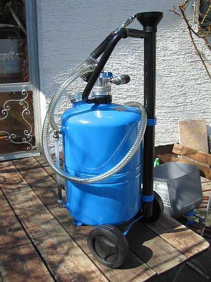 | Die Fa. Westfalia hat ein Ölabsauggerät (Nr. 198135) der italienischen Fa. Ametec (www.ametec.it), Modell 10024, im Programm (April 2010, 279,99 Euro inkl. MwSt.), das mit etwa 0,7 bar Unterdruck arbeitet. Dieser Unterdruck wird mittels Pressluft durch eine Venturi-Düse (seitlich am Manometer) erzeugt. Es ist also kein Motor mit Pumpe vorhanden. Der Behälter ist mit 24 Liter groß genug, es können 2/3 des Tankvolumens zum Absaugen genützt werden. Es darf nur warmes Öl abgesaugt werden. Drei Anschlussadapter, zwei gerade Absaugrohre aus Metall und drei biegsame Absaugschläuche sind dabei. | ![]() |