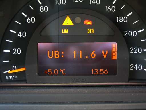 | Nach dem Starten des Motors werden unabhängig von der Drehzahl zunächst 14,6 V angezeigt, dann sinkt die Spannung auf 14,2 V, wenn sich beim G270CDI der elektrische Zuheizer einschaltet (unter 8 Grad C und kaltem Motor) oder andere Verbraucher eingeschaltet sind. Bei längeren Fahrten sind konstant 14,2 V vorhanden. Spannungsanzeige: Text als Pdf zum Ausdrucken. |