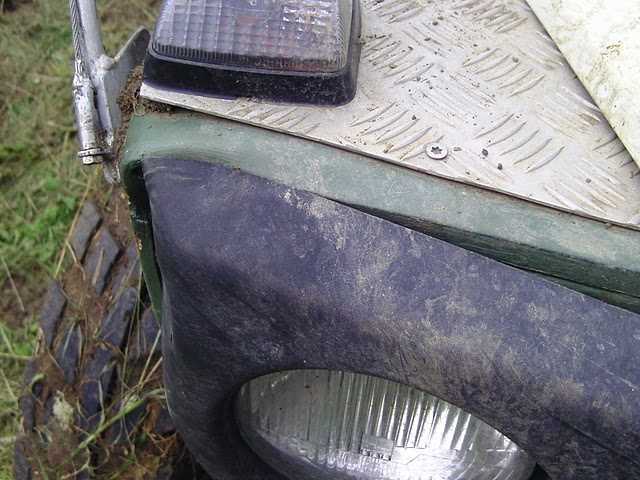 | Die Astabweiser waren aus Zeitgründen vor der Trophy oben nur mit Blechschrauben befestigt. Als Clemens am Dienstag fuhr, riss die obere Befestigung ab. Eine solide Platte mit zwei M8-Muttern wird angeschweißt. Da kann dann auch ein Bügel über der Windschutzscheibe für die Flutlichtscheinwerfer angeschraubt werden. | ![]() |
