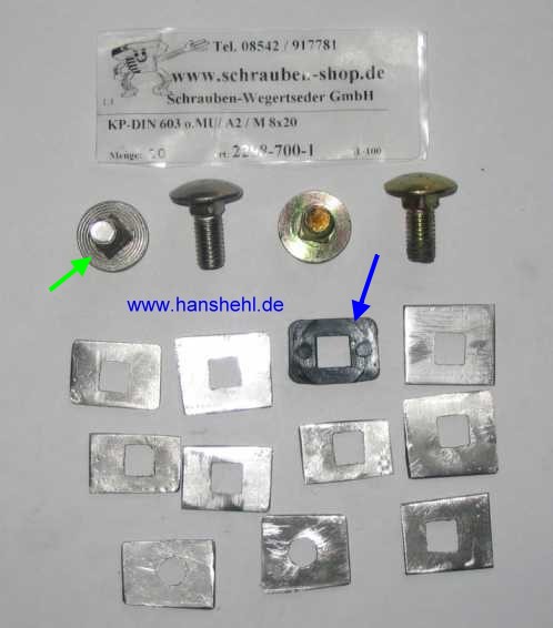 Ich habe mir mal schnell aus 1mm starkem V2A-Blech passende Plättchen gefertigt. Das 8 mm Loch wird mit einer Vierkantfeile eckig ausgefeilt. |