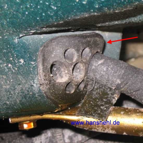 21. Stöpsel: Die Plastikstöpsel für die Schrauben der Kotflügelverbreiterung sind durch zu feste Schläge mit dem Hammer beim Einsetzen schon gesprungen. Hier ist auch eine Wachskonservierung sehr wichtig. Der Gummistöpsel für den Kabelbaum am hinteren linken Radlauf war unvollständig eingedrückt, Wassereintritt und Rost möglich. |
