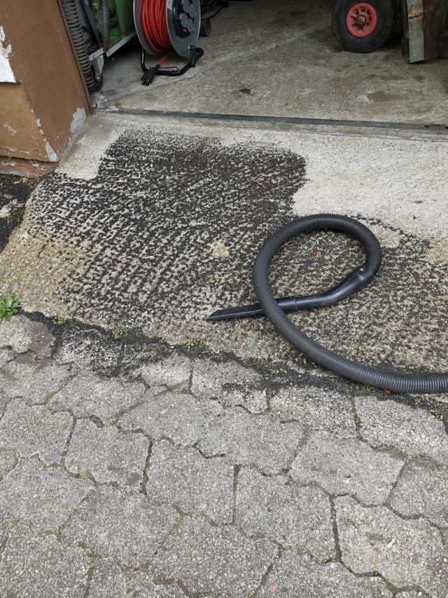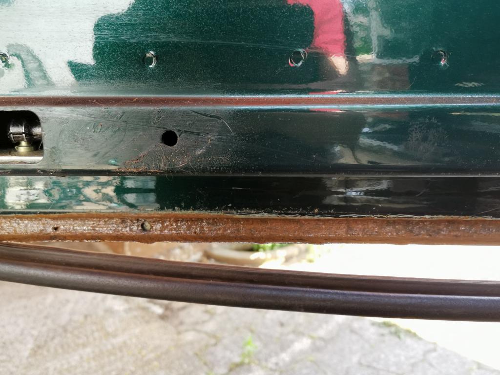 Am 20.06.23 verwendete ich wieder meine Strahleinrichtung tipp2.htm#b6 mit dem schwarzen Kunststoffgranulat. Ich habe einen Gesichtsschirm und eine Metall-Strahlpistole mit Becher. Die braunen Stellen müssen noch weg. Mit dem Schälbohrer bohrte ich zwei zusätzliche größere Servicelöcher, damit ich mit dem Sprühwachs auch an den Falz komme. |