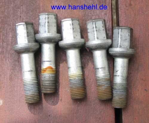 Ende August 2006 zeigen die anfangs nicht gefetteten Radschrauben schon den ersten Rost im Gewinde. Die Thematik "Radschrauben fetten" wird im tipp65.htm#b2 erörtert. |