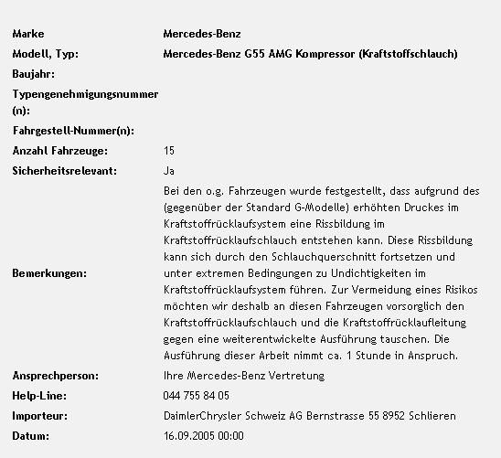 | Wer sucht, der findet: Es gab eine Webseite www.auto-schweiz.ch mit allen Rückrufen der Autohersteller: Seit 06.04.2016 ist die nicht mehr öffentlich ist. Da war auch dieser Rückruf (ab 7.9.2005) vom G55AMG enthalten. Die Kunden wurden direkt von DC informiert (betroffene Fahrzeuge sind im System VEGA gekennzeichnet), siehe Servicebox, Rückrufe Stand 04.2021: https://www.kba-online.de/gpsg/jsp/gpsgStart.jsp und https://www.adac.de/infotestrat/reparatur-pflege-und-wartung/rueckrufe/default.aspx |