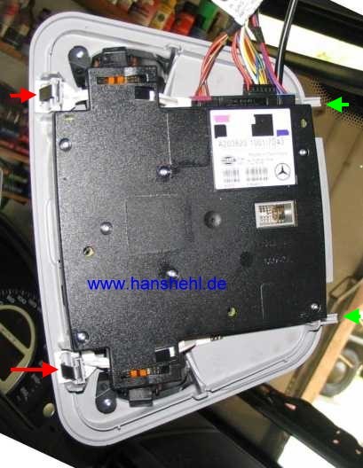 Die unteren Zapfen (grüne Pfeile) nicht abbrechen. Am Spiegelfuß sitzt der Infrarotsensor des nachgerüsteten