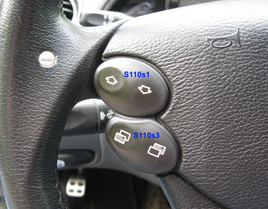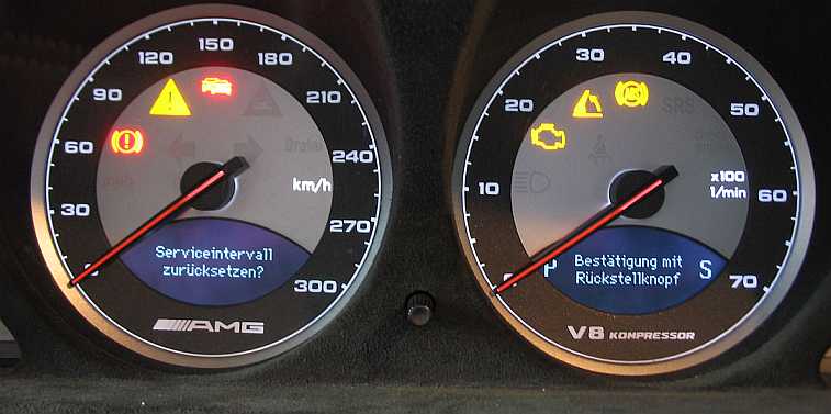 Zündung einschalten, links am Lenkrad unteren Taster S110s3 (Systemauswahl) wiederholt drücken, bis im Display der Gesamtkilometerstand erscheint. Dann mit Taster darüber S110s3 (Vor- oder Zurückblättern) zum Werkzeugschlüssel-Symbol blättern. Resetknopf (Helligkeitsregler) mehr als 4 Sek. drücken: Die Meldung "Wollen Sie das Serviceintervall zurücksetzen? ... " erscheint. Resetknopf wieder 4 Sek. drücken. |