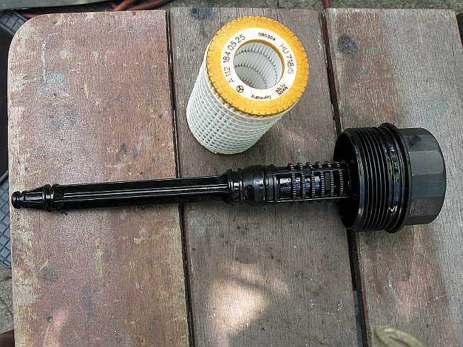 Der Vlies-Ölfilter A0001802609 ist der gleiche wie beim G55AMG und dort beschrieben: tipp36-1.htm#b41 . Der Ölfilterhalter ist nur handfest angezogen (25 Nm). Es gibt von der Fa. Hazet einen Filterschlüssel 2169 zum leichten Abschrauben. Vor dem Einschrauben mit der Hand wird die Gummidichtung leicht eingeölt. |