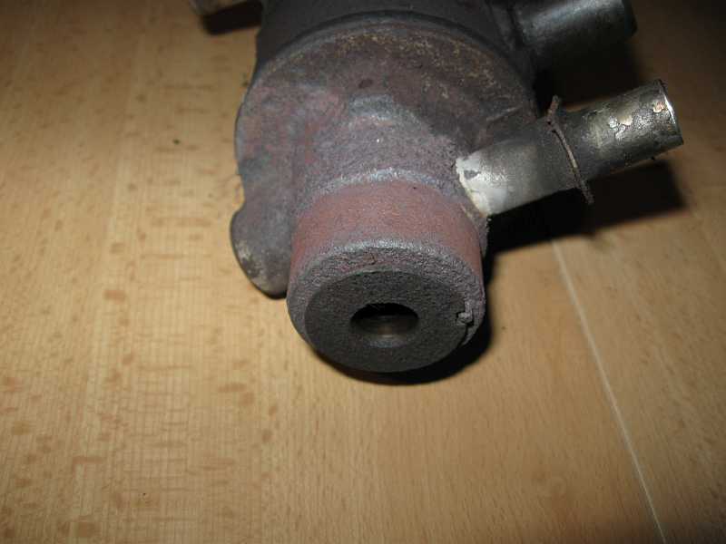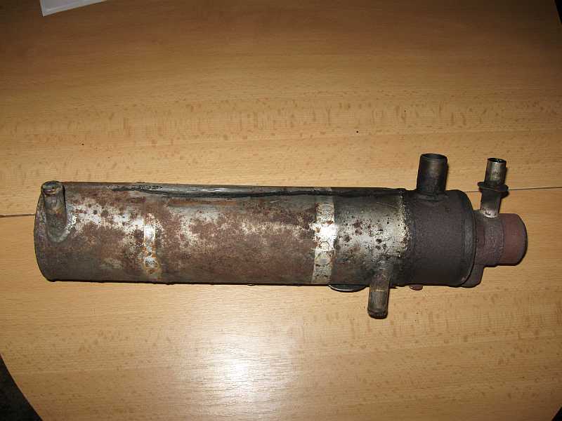 Das Kernstück der Wasserheizung ist das Heizrohr (15), ein schweres und stabiles Gußteil mit angeschweißtem Wärmetauscher. |