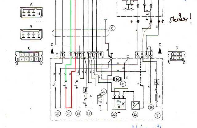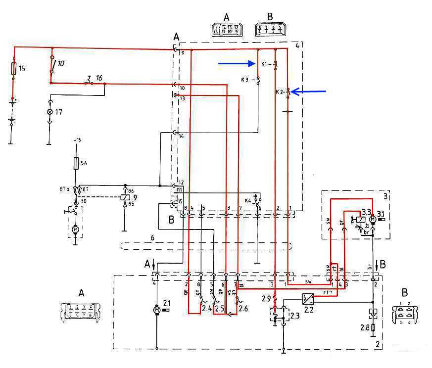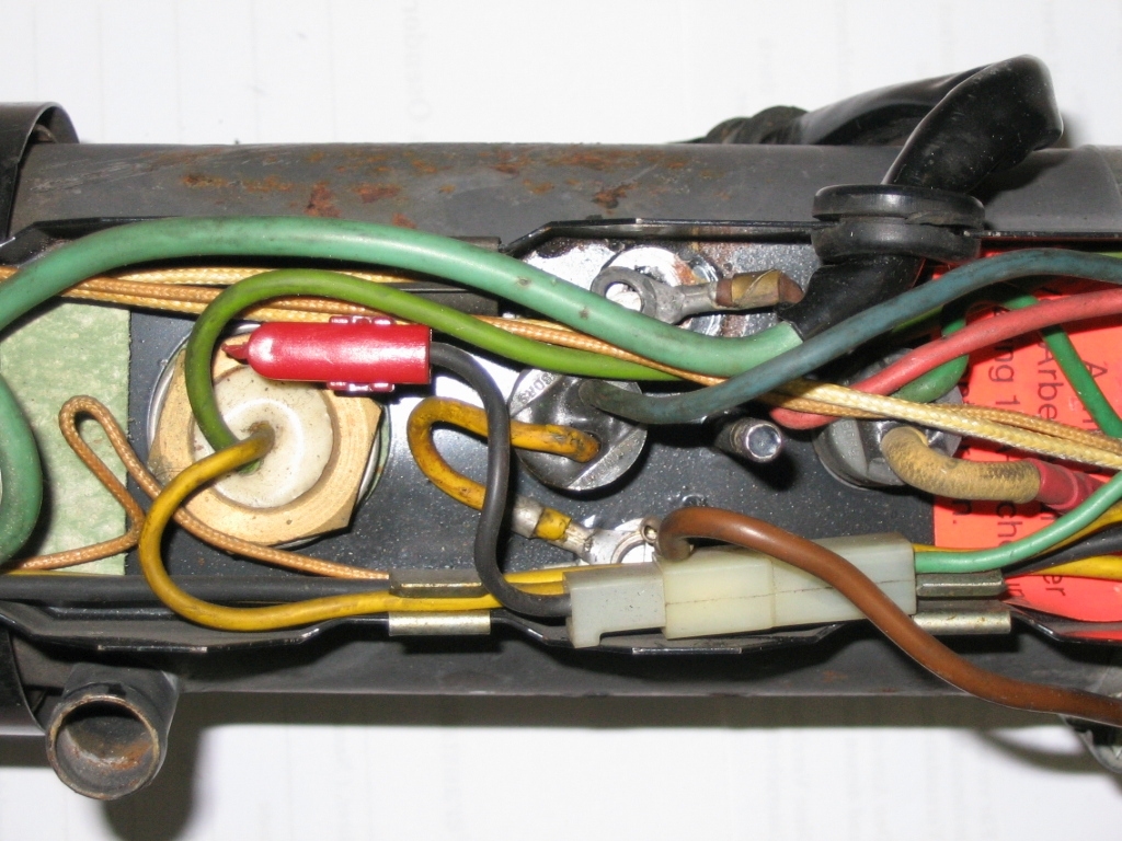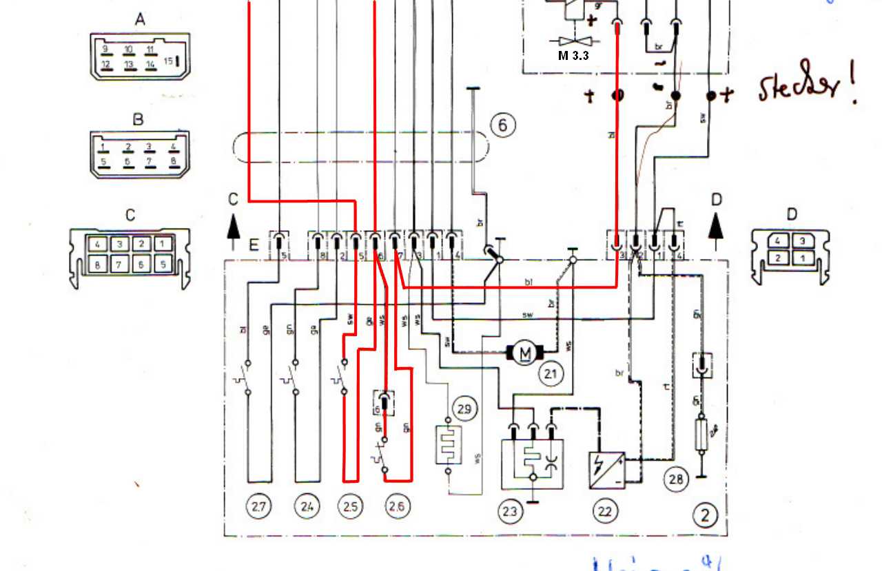 Die Schaltpläne liegen auch als Pdf vor: Schaltplan 1, Schaltplan 2. Hilfreich ist da auch die Verteilerplatte im Kabelbaum zwischen Steuergerät und Heizung, die ich im Radlauf vorne rechts 2014 einbaute (siehe Restauration). Das Steuergerät der WO2352-Heizung ist am Stecker A/9 über eine Sicherung (15) mit Dauerplus verbunden. Damit haben auch die Anschlüsse B/4 und am Heizgerät A2 Dauerspannung. Damit hat der Brennwächterthermostat (2.4) an der gelben Leitung auch 12V. |