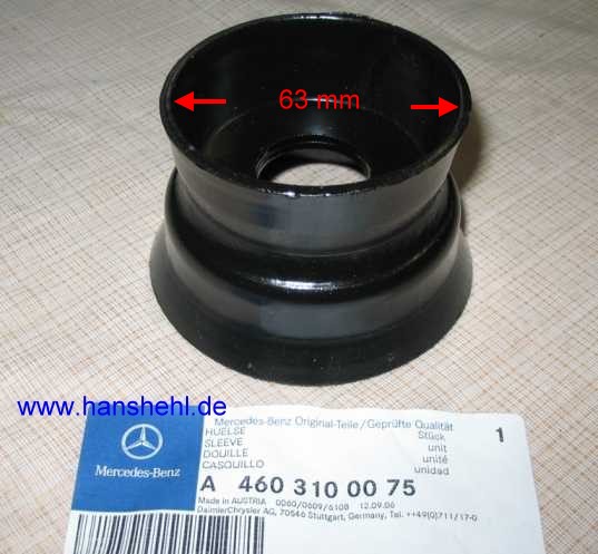 Da die Größe der Teile aus dem EPC nicht hervorgeht, habe ich mal Probeeinkäufe getätigt. Die Teile findet man z.B. bei 460 in Gruppe 31 Rahmen (am besten Filter löschen mit F7). Auch für die Aufbaulagerung rechts und links hinter dem Vorderrad gibt es die Teile. Die Hülse A4603100075 - 13,84 Euro ohne MwSt. (1. Bild) besteht aus zwei zusammengeschweissten Teilen, die man bei Bedarf trennen könnte. siehe auch den Bericht Aufbaulagerung beim 280GE. |