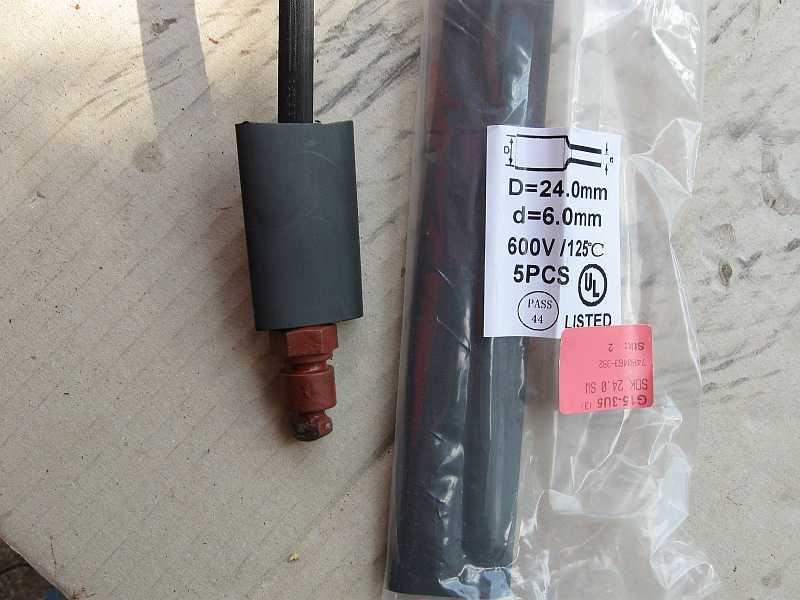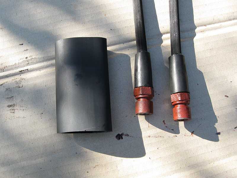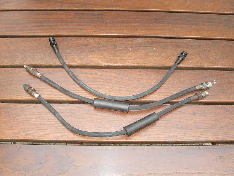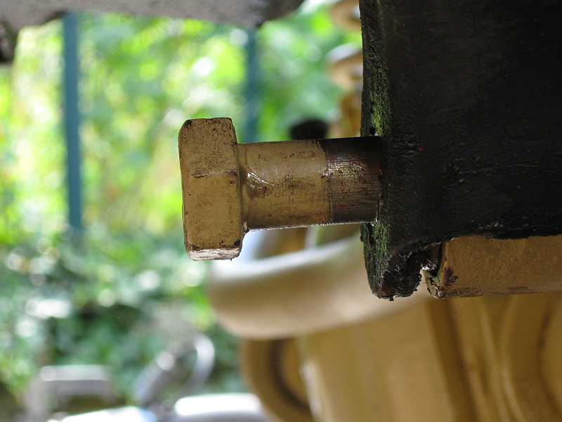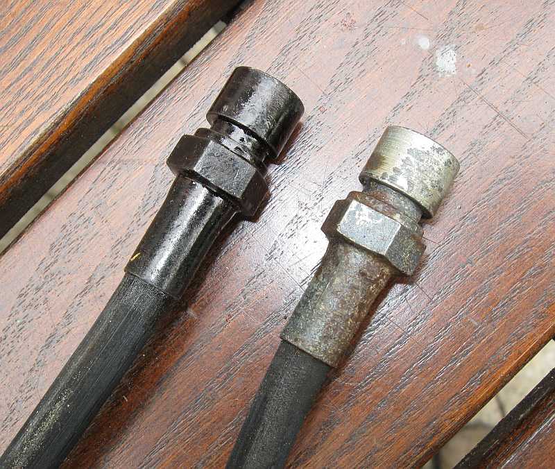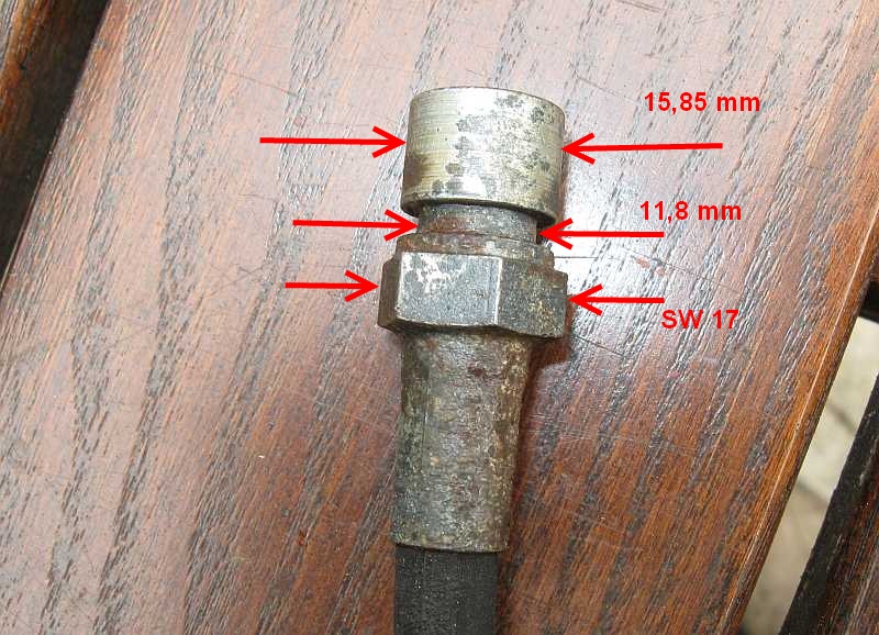 Die Bremsschläuche der Vorderachse sind nicht rissig und noch gut. Die auf beiden Seiten gleichen Anschlüsse (Innengewinde M10x1) werden mit selbstgebauten Einsätzen verschlossen und sandgestrahlt, chemisch entrostet und grundiert. siehe auch Rund um die Bremse. |