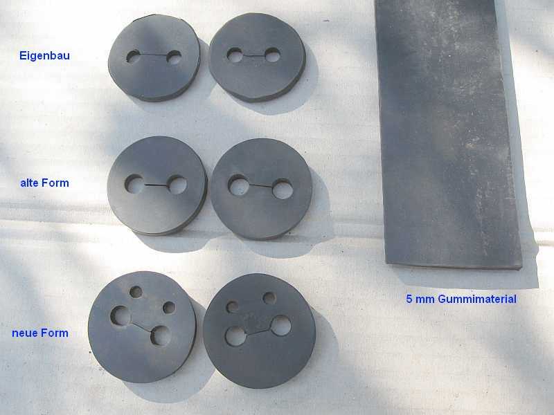 Auch die Abstandshalter der Bremsschläuche kann man aus 5 mm dickem Weichgummi selber anfertigen. Ein 50 mm Henkel-Stanzeisen kostete über 40 Euro, lohnte sich also nicht. Ich schneide die Scheiben mit der Schere aus und runde die doch etwas eckigen Scheiben mit einer Fächerschleifscheibe in einer kleinen Flex. Mit einem kleinen 8mm Stanzeisen werden die zwei Löcher für die beiden Leitungen gemacht, mit einem breiten Stemmeisen dann der Schlitz. zur Restauration 2014 Teil 3 |