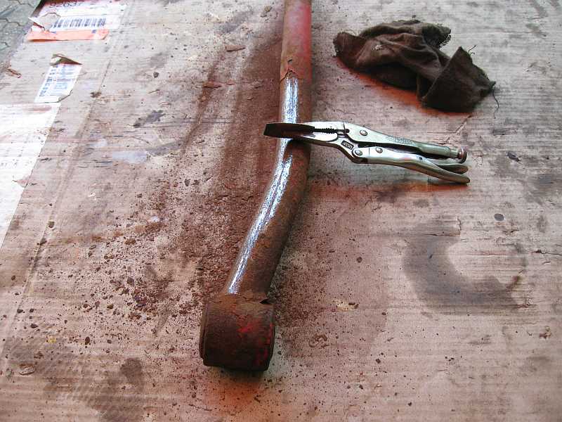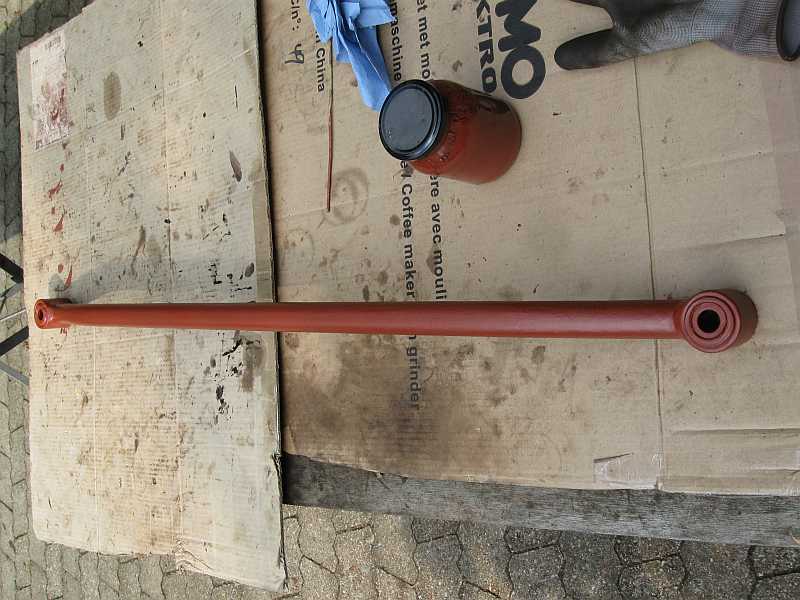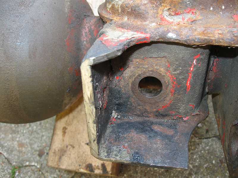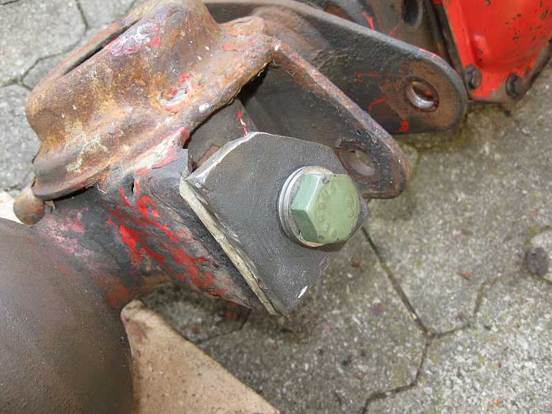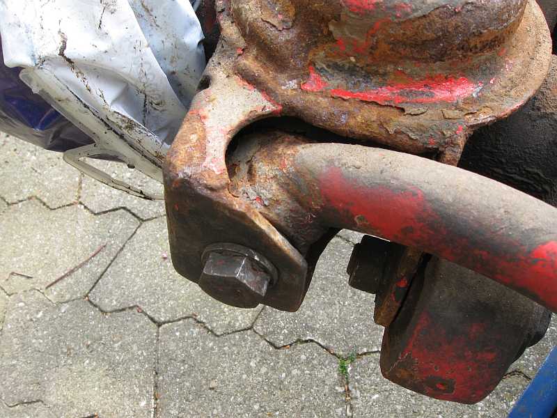 | Das abgetrennte und verbogene Teil wird gerichtet, abgeschrägt und mit neuer Buchse und Schraube an der Achse fixiert und angeschweißt. | ![]() |