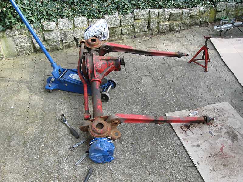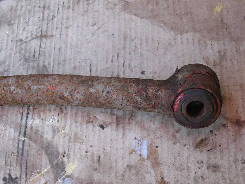 | Also das vordere Halteblech an an den Seiten abflexen, der Panhardstab ist ausgebaut. Selbst mit einer 20 to-Presse gelingt es nicht den Schraubenstumpf aus der Gummilager-Buchse zu pressen. | ![]() |