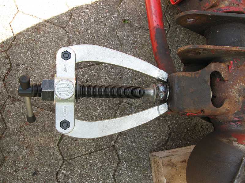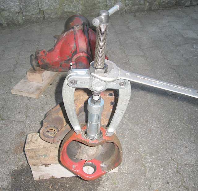 | Die Lagerschalen der Achsschenkellager werden auch ausgebaut, da ja die Achse sandgestrahlt wird. Das Mercedes-Werkzeug eignet sich sehr gut dafür. | ![]() |