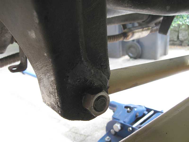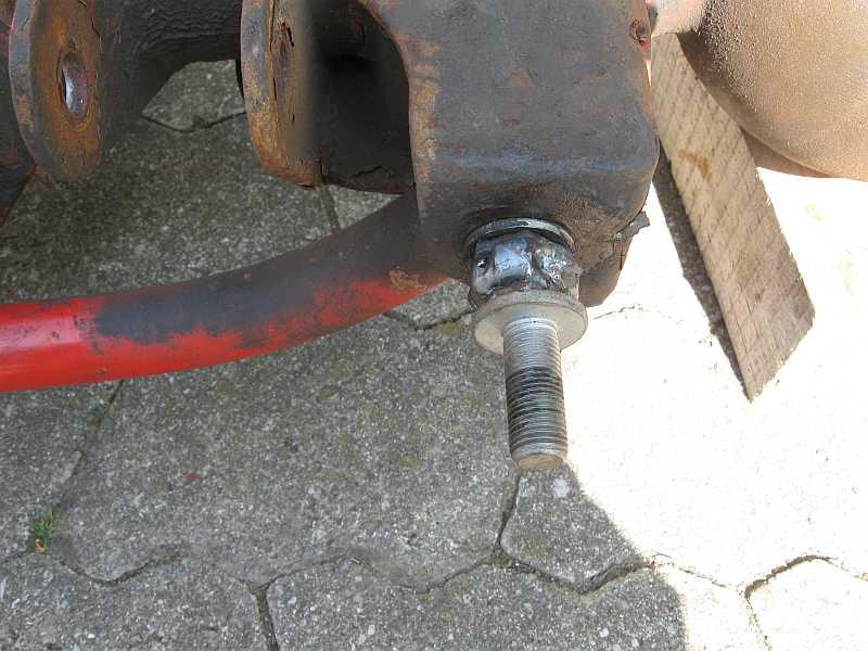2005 hatte ich schon das Problem der in der Gummilagerbuchse des Panhardstabs festgerosteten Schraube gehabt. Bei der Restauration anfangs April 2014 ist es das gleiche Problem. 2005 verwendete ich zum Glück eine V2A-Mutter M16x1,5. |