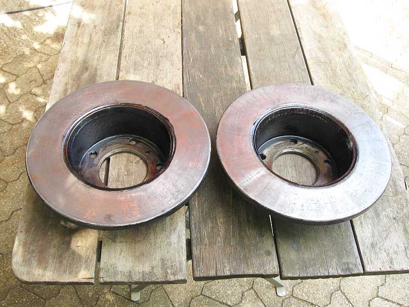 | Die entrosteten Bremsscheiben sind im Topf mit Brunox konserviert und hauchdünn gefettet. Da sie nach dem Einbau noch längere Zeit nicht benützt werden, werden die Bremsscheiben beidseitig mit dem Konservierungsspray von Würth eingesprüht. Der Film kann dann abgebremst werden. | ![]() |