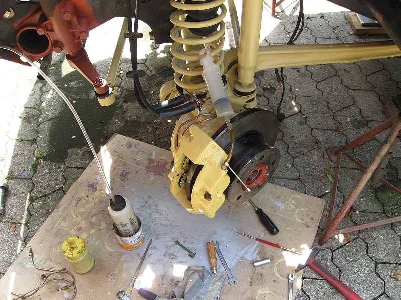 Ende der 2. Juli-Woche 2014 sind die Bremssättel angeschraubt und die Bremsklötze mit neuen Halteblechen und Stiften eingebaut. Die Bremsen sind schon mit Eezi-Bleed entlüftet und die Räder anmontiert..