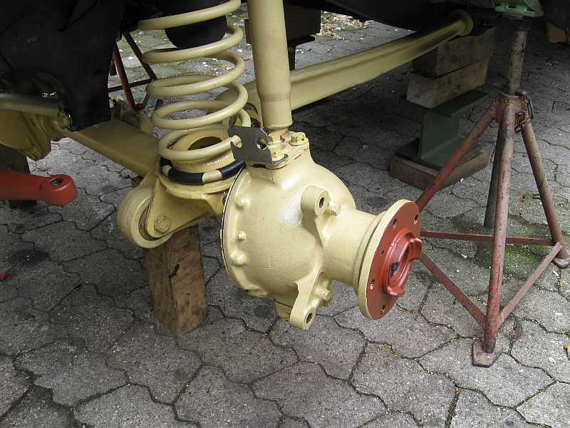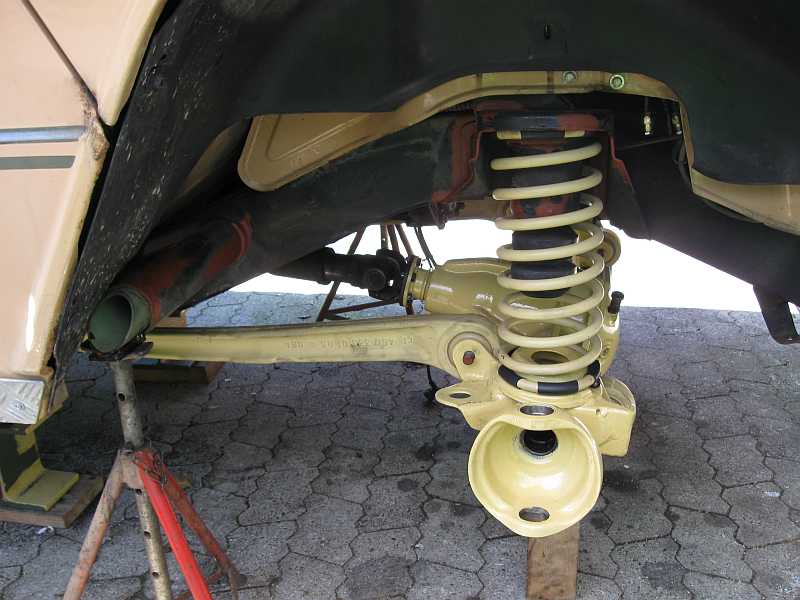 | Unter den Federtellern war die Farbe auf den Rost aufgetragen. Also auch hier nacharbeiten. Ich hätte die Federteller vor dem Sandstrahlen abtrennen sollen. Nun habe ich eine Sandstrahlfirma in der Nähe gefunden: www.sandstrahlen-haimerl.de , die sich auch auf Oldtimer spezialisiert hat. | ![]() |