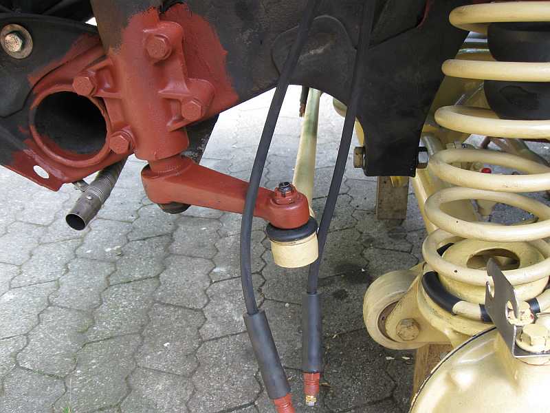 | Ich fette entgegen den Arbeitsweisungen von Mercedes den Konus der Spur- bzw. Lenkstange hauchdünn ein, damit sich kein Rost bilden kann. Die restaurierten Bremsschläuche sind auch eingebaut. Zuerst wird oben der Bremsschlauch angeschraubt. Hält man das untere Ende etwas hoch, kann die Bremsflüssigkeit blasenfrei den Schlauch füllen, bevor eine Verschlusskappe eingeschraubt wird. | ![]() |