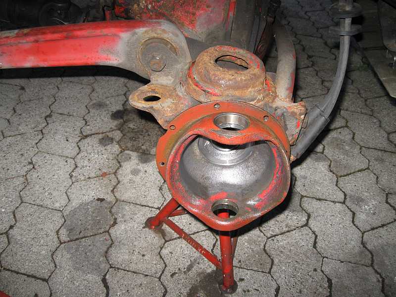 Nach Lösen der beiden Radnabenmuttern kann die Radnabe herausgezogen werden. Das Radlager wird mit dem Abzieher abgezogen und die verrosteten Bereiche der Radnabe werden sandgestrahlt, siehe die Berichte( 280GE und 240GD). |