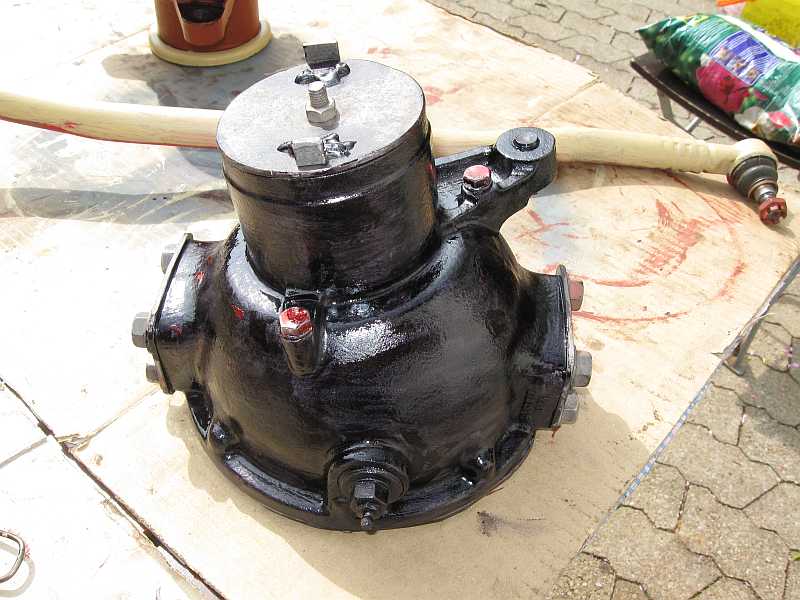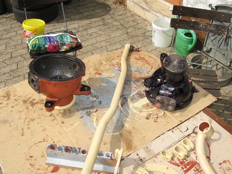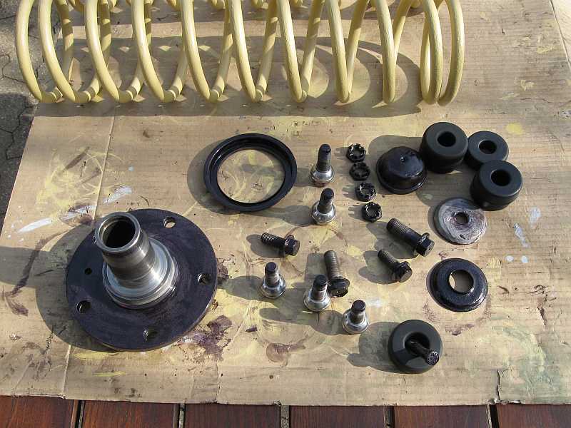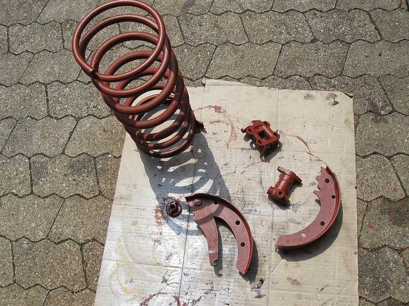 Die Kleinteile lassen sich in der Sandstrahlbox gut sandstrahlen. Der Gummipuffer ist mit einer durchbohrten Schraube, einer Druckplatte (2. Bild) und einem Abstandsring befestigt. Den Gummipuffer kann man mit einem Gummipflegemittel (zugleich Rostlöser) reinigen, siehe Einbau des Gummipuffers. |