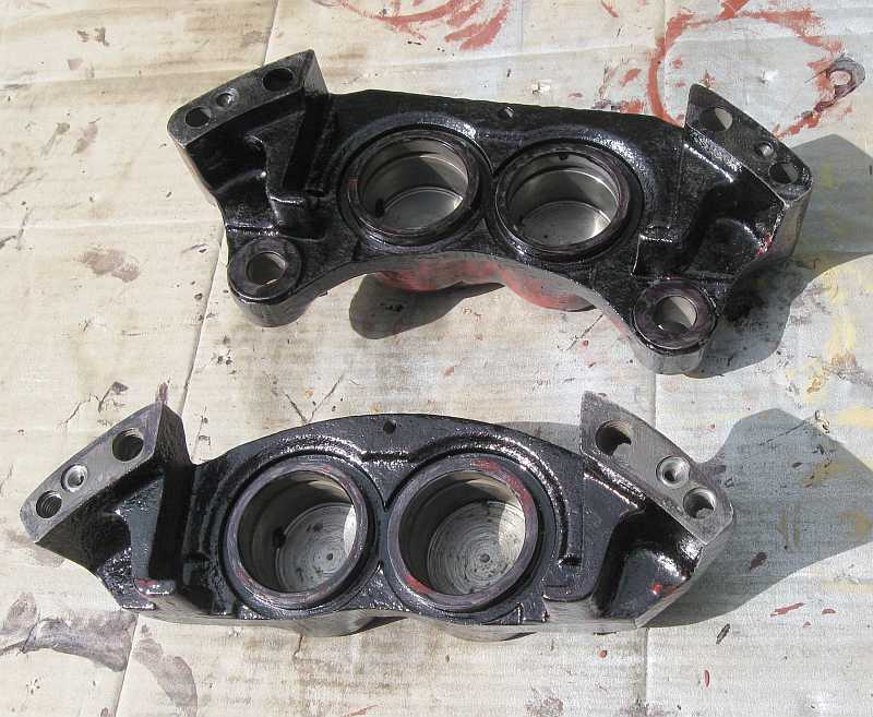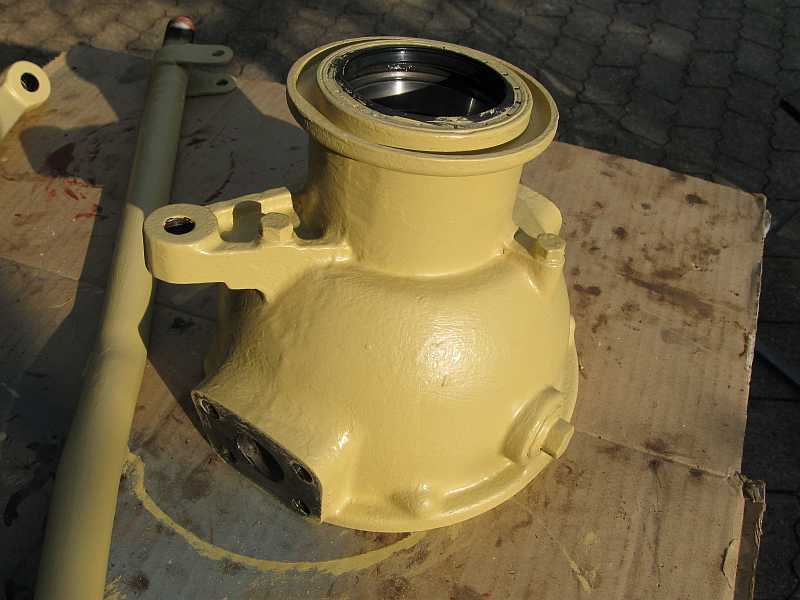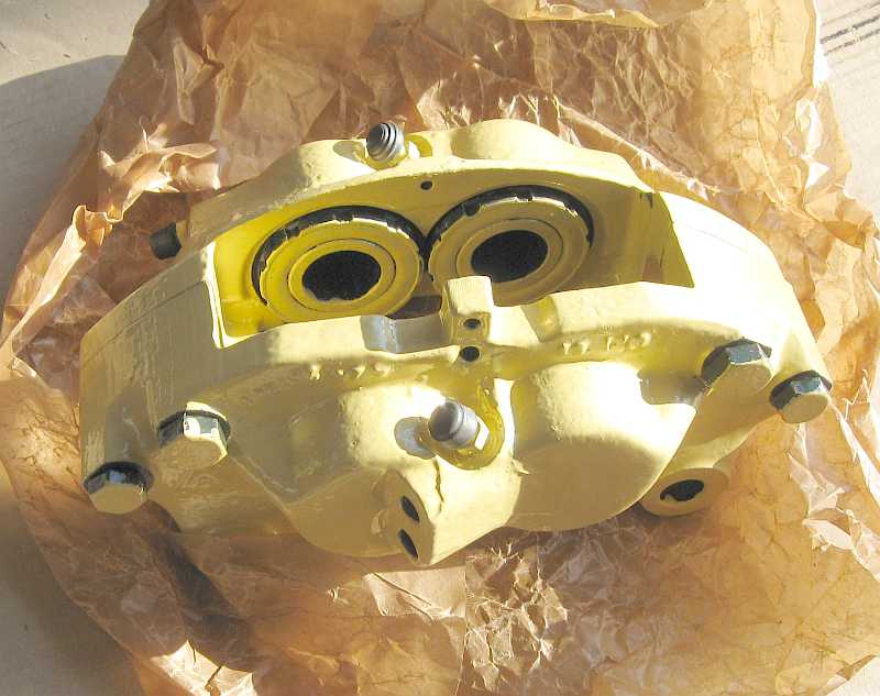 Ein 2009 aufbereiteter Bremssattel (tipp98-3.htm#b15) war tannengrün lackiert. Er diente als Reserve und erhielt nun eine andere Farbe mit hitzebeständigem sandgelben Urethanlack. |