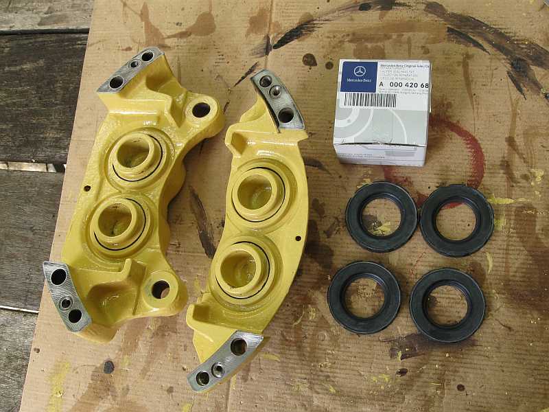 Der rechte Bremssattel vom 240GD ist sandgestrahlt, chemisch entrostet und neu aufgebaut. Bei den originalen Gummikappen des Reparatursatzes A0004206883 schaut die Metalleinlage oben heraus, Rost ist hier schon vorprogrammiert. |