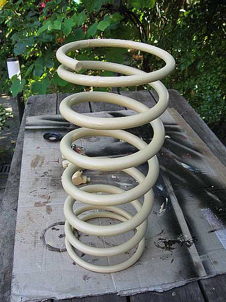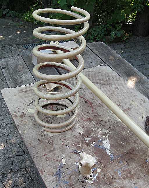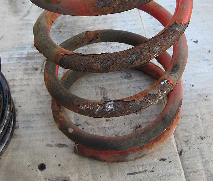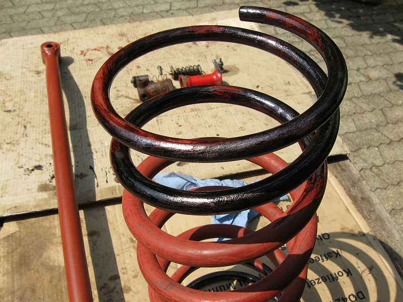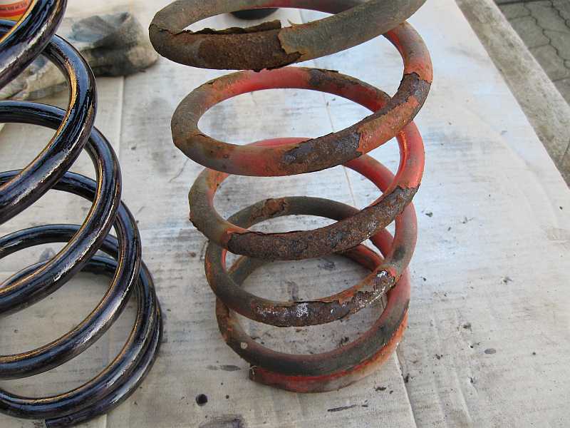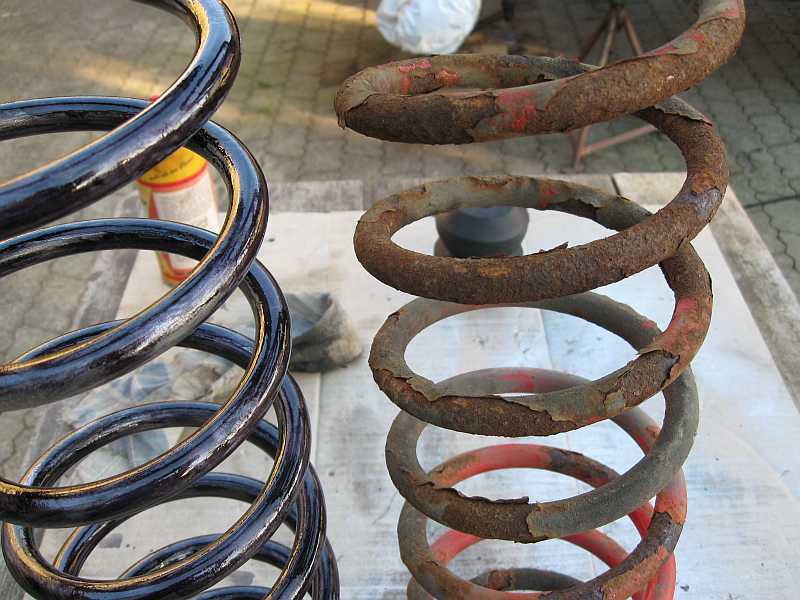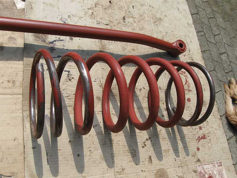 | Beim Entrosten zeigt sich auch, dass ich 1987 schon mal neue Federn vorne einbaute: A4603210204 gelb mit Jahreszahl (87),siehe Federtabelle. |