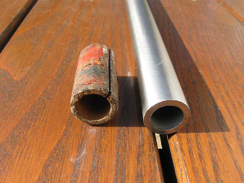 Da der untere Rand der Blechhülle verrostet ist, wird er einfach weggeschnitten. Nun kann man auch besser den inneren Rand etwa 10 cm tief mit Brunox behandeln. Der untere Teil wird sandgestrahlt und wie üblich lackiert. siehe auch tipp49.htm#b3. |