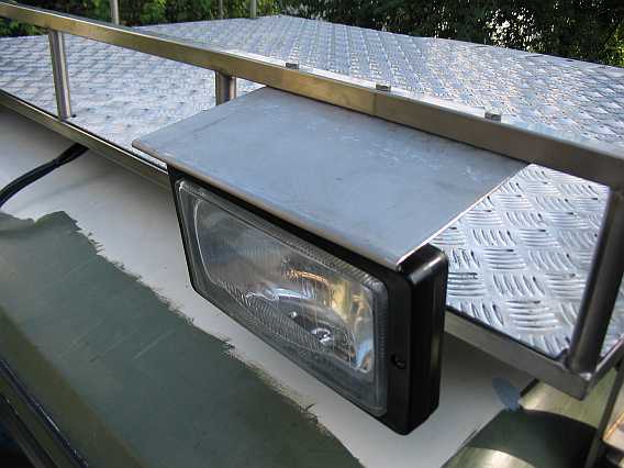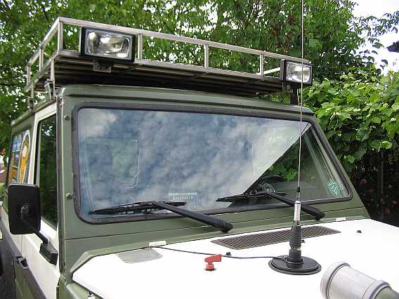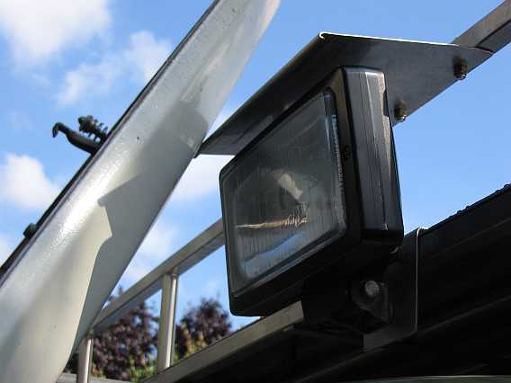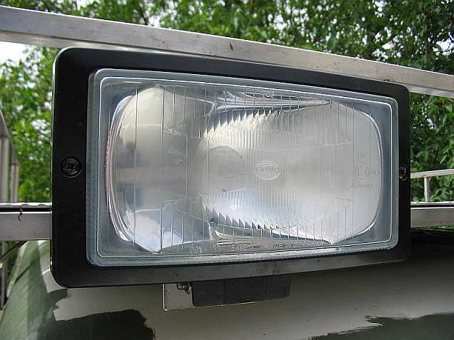 Am Dachgepäckträger können nun die Flutlichtscheinwerfer Jumbo 220 von Hella (Typ 1FE 006 300-04, Prüfzeichen E1 44444, 242 mm x 166 mm, Lichtaustritt 205 mm, H3-Halogenbirne) montiert werden (Danke, René).