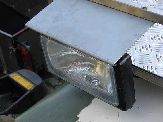 | Ein stabiles 1,5 mm dickes V2A-Blech schützt als Dach den Scheinwerfer und dient als Anlegekante für die Motorhaube. An die Außenseiten der Schweinwerfer kommen noch stabile Astabweiserbleche. | ![]() |