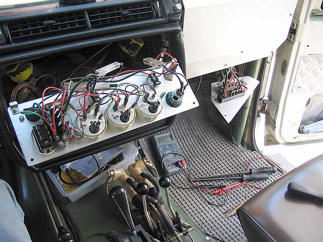 Ich habe so einen Schalter beim 280GE für die Seilwinde zum Einschalten der +12 Volt für die Fernbedienung ins Armaturenbrett eingebaut. Über eine Sicherung mit 15 A können die Scheinwerfer direkt angeschlossen werden. Ein Kabelquerschnitt von 4 Quadrat-mm ist bei der kurzen Leitungsführung durchs Dach ausreichend.