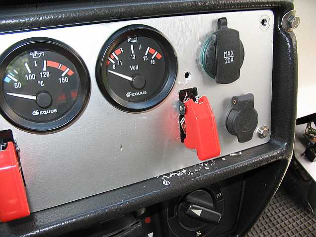 | Die beiden Scheinwerfer haben zusammen eine Stromaufnahme von 110 Watt, also 8,33A. Die Sicherheitsschalter von z.B. ISA-Racing (siehe Elektrozubehör) sind für 25 Amp ausgelegt (Bestell-Nr. 6010-1, 3,30 Euro inkl. MwSt., 12 V 25A, Wechselschalter, 12 mm Gewindehals). Dazu kommt die rote Schutzkappe Nr. 6012-0, 4,00 Euro inkl. MwSt.) | ![]() |