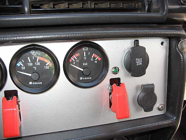 | Eine grüne LED-Kontrolllampe benötigt ein 8 mm Loch im Armaturenbrett. Der Messinganschluss ist der Pluspol für 12V. | ![]() |