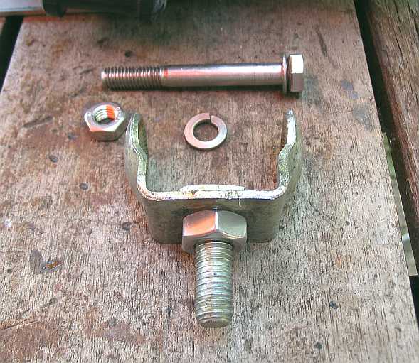 | Eine 3 mm starke V2A-Platte 100x80 mm wird auf der Schmalseite (20 mm breit) abgekantet und am unteren Quersteg des Gepäckträgers mit zwei langen M-6-Schrauben und Stoppmuttern befestigt. | ![]() |