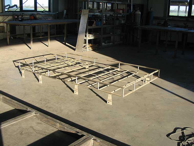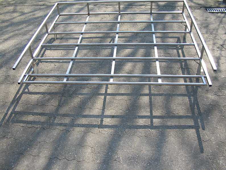 | Zur Stabilisierung des Trägerbodens an der abgetrennten Seite wurden zusätzliche Randstreben eingeschweißt. Die Enden der Seitenwandstreben mussten für die Rohrverbinder frei bleiben. | ![]() |