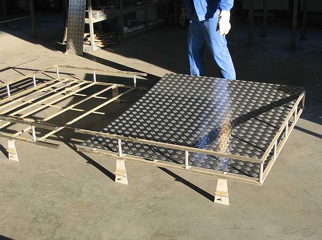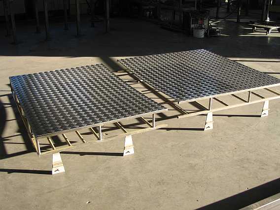 | Die zwei Alu-Riffelblech-Bodenplatten werden mit V2A-Bügel am Träger befestigt. |