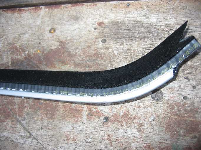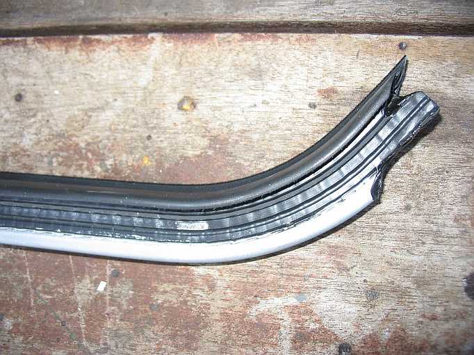 | Die Fensterscheibe wird innen und außen von Abdichtungsschienen geführt. Die innere Schiene wird an einer Seite von dem Gabelende gehalten, eingedrückt und am anderen Ende angeschraubt. | ![]() |