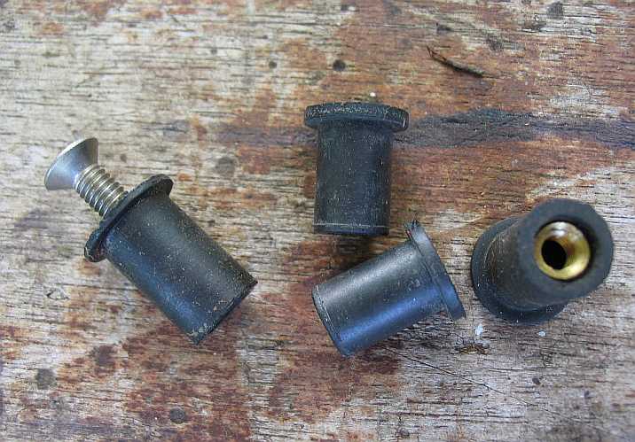 | Befestigt ist die Ablageschale unten mit diesen Gummistopfen A 000 988 06 25 - 1,43 Euro ohne MwSt.,(9 mm Durchmesser) mit Messing-M4-Gewindeeinsatz. Die Ablageschale hält unten auch die Türverkleidung fest. Billiger und stabiler sind die Plastikstöpsel A 460 994 01 45 - 0,29 Euro ohne MwSt, dazu muss aber das Loch auf 10 mm aufgebohrt werden | ![]() |