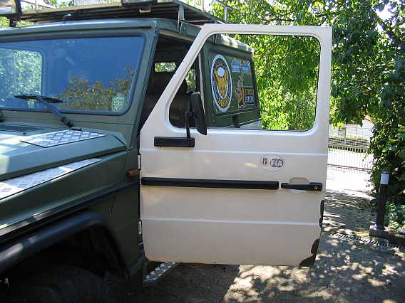 | Bei meinem 240GD trennte ich schon 1997 die angeschweißten Scharniere von den Türen ab. Dazu benutzte ich einen Metallfräser, es war sehr mühsam, hat sich aber gelohnt, siehe hier. Nach einer "stabilen Seitenlage" im Frühjahr 2001 war der Austausch der verbogenen Tür dann problemlos. Bald hatten ab Werk die neuen Türen am inneren Verstärkungsblech die angeschweißten Muttern (siehe 3. Bild vom G55AMG, Beifahrertür, unteres Scharnier). | ![]() |