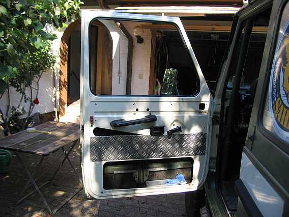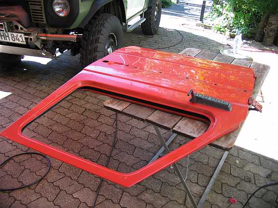 | Die rote Tür passt nicht zum grünen 280GE. Der Lack wird nun angeschliffen und mit der Bundeswehrfarbe RAL 6003 grün gestrichen. | ![]() |