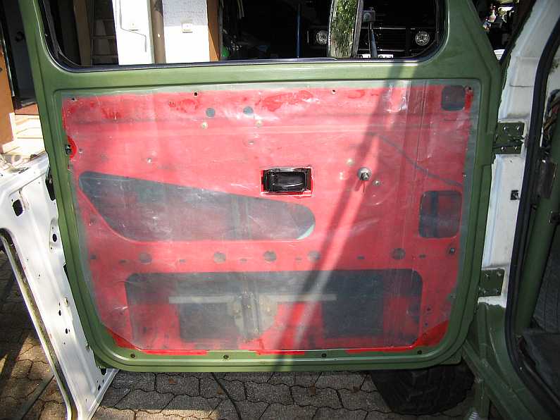 Damit die Hartpappe-Tür-Innenverkleidung nicht durch das eingedrungene Wasser zerstört wird, muss unbedingt eine Türfolie angebracht werden. Ich verwende die kräftige Baufolie vom Baumarkt. Auch bei den Türen vom G55AMG, z.B. Fahrertür, ist diese Folie eingebaut. |