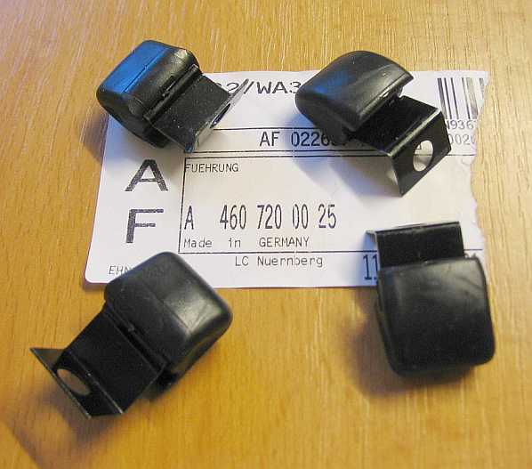 Die Befestigungsklammern für die Verkleidung gibt es in zwei Ausführungen, sind aber gleich: 460: A0019883478 6014 - 1,85 Euro ohne MwSt. und beim 463: A4639880278 - 1,52 Euro ohne MwSt., siehe auch Tür 240GD und Tür G55AMG. |