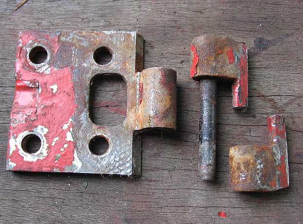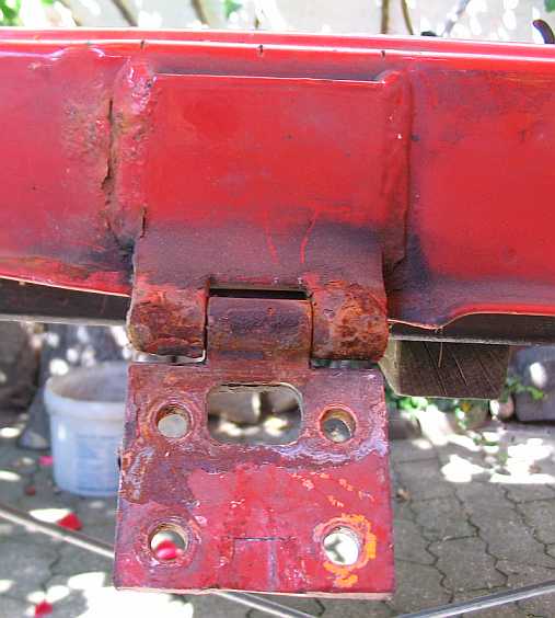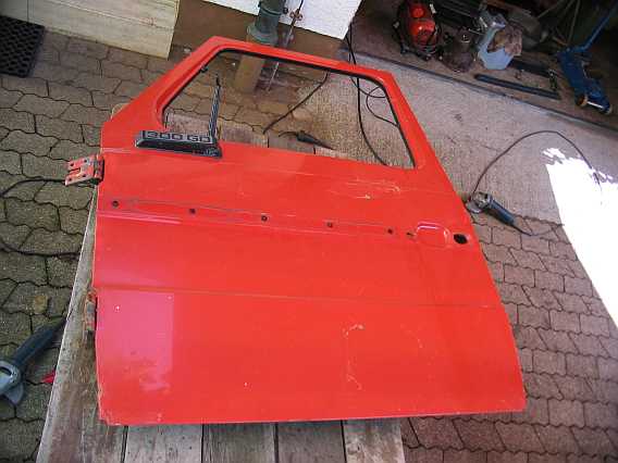 | Dann konnte ich eine gut erhaltene rot lackierte Fahrertür (300GD) kaufen. Die alten schwergängigen Scharniere sollten durch fast neuwertige und anschraubbare ersetzt werden. | ![]() |