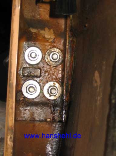| Mit vier M8-V2A-Schrauben mit großen Unterlegscheiben sind die Scharniere beim 240GD an der Tür angeschraubt (Bilder: unteres Scharnier). | ![]() |